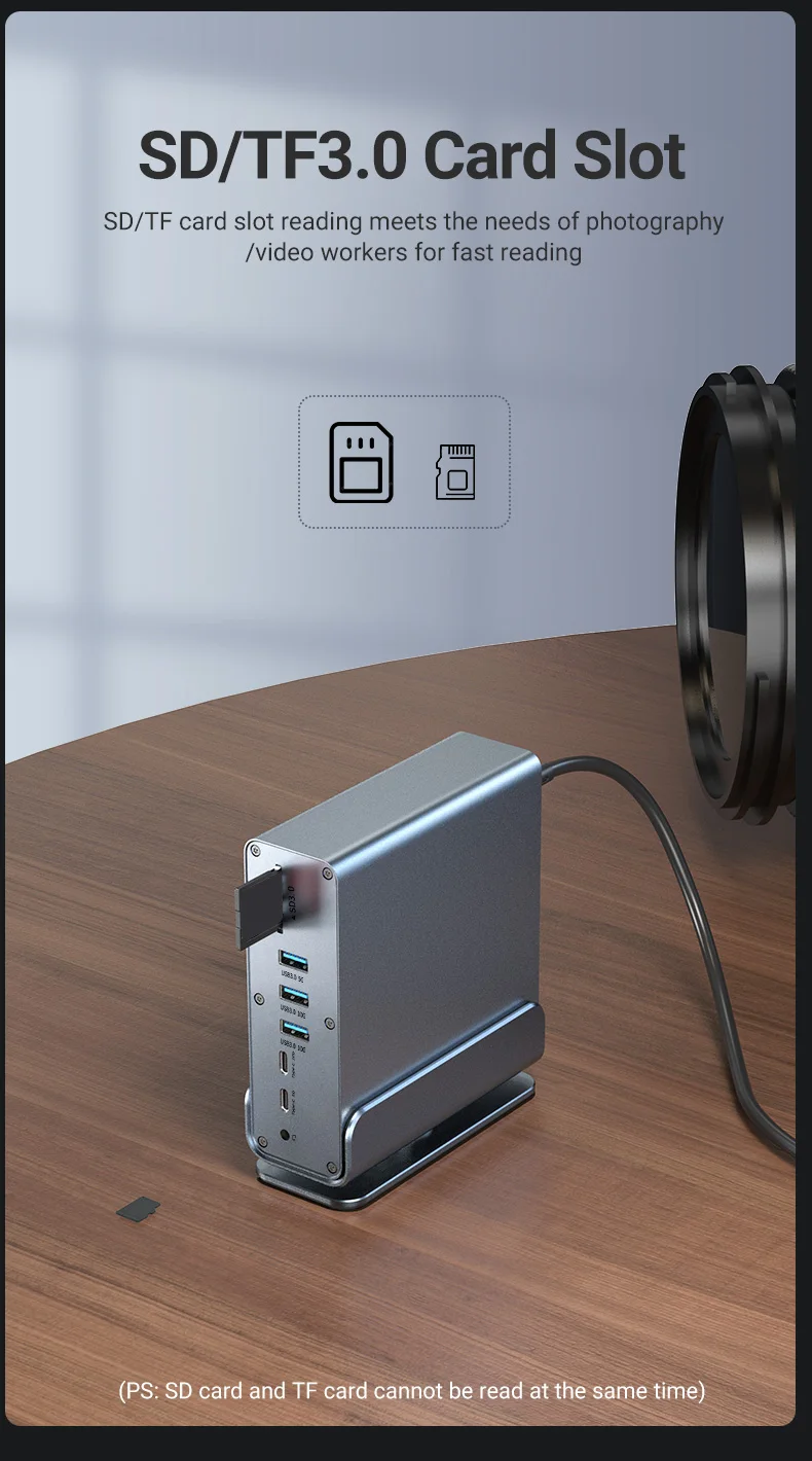 • Expansive Storage Capability :The docking station includes an SD/TF card slot, providing ample space for storing and accessing your multimedia files.