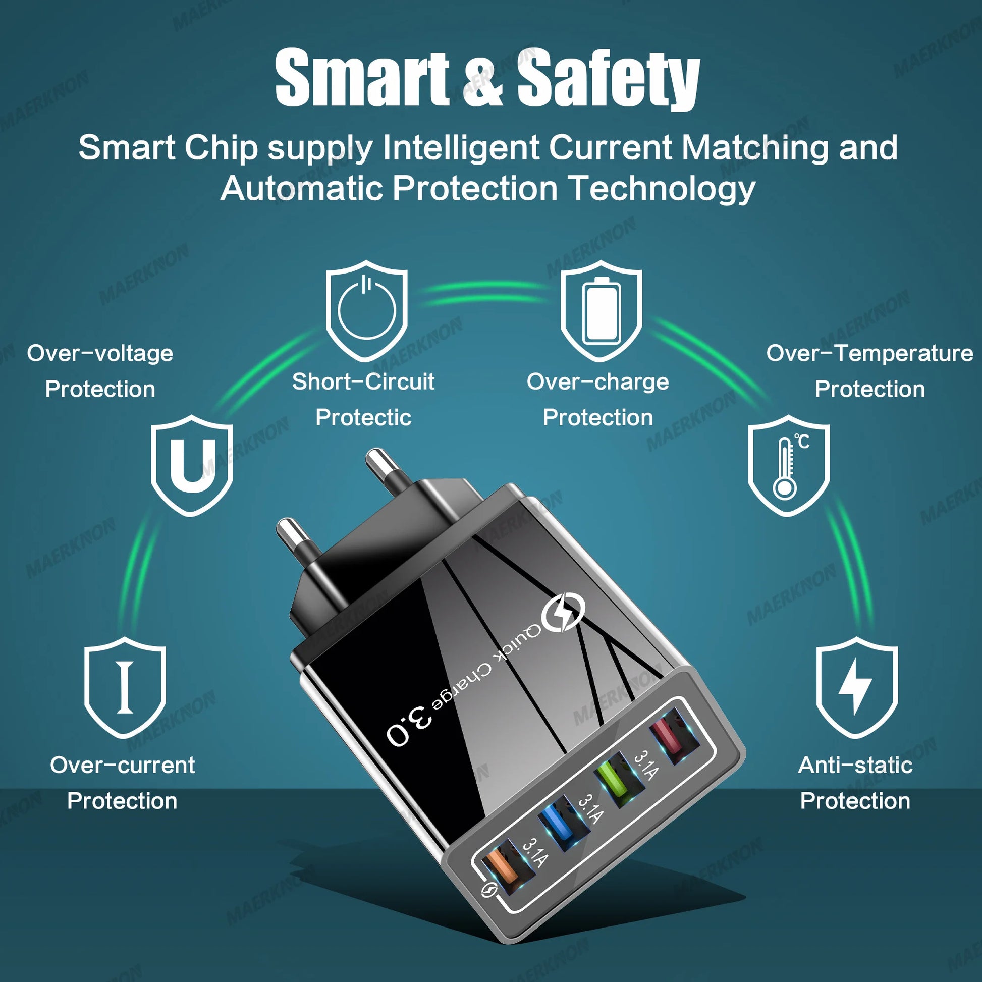 3A USB Charger 4 Ports USB Quick Charge 3.0 EU US Plug For iPhone Samsung Xiaomi Poco Fast Charging Mobile Phone Charger Adapter