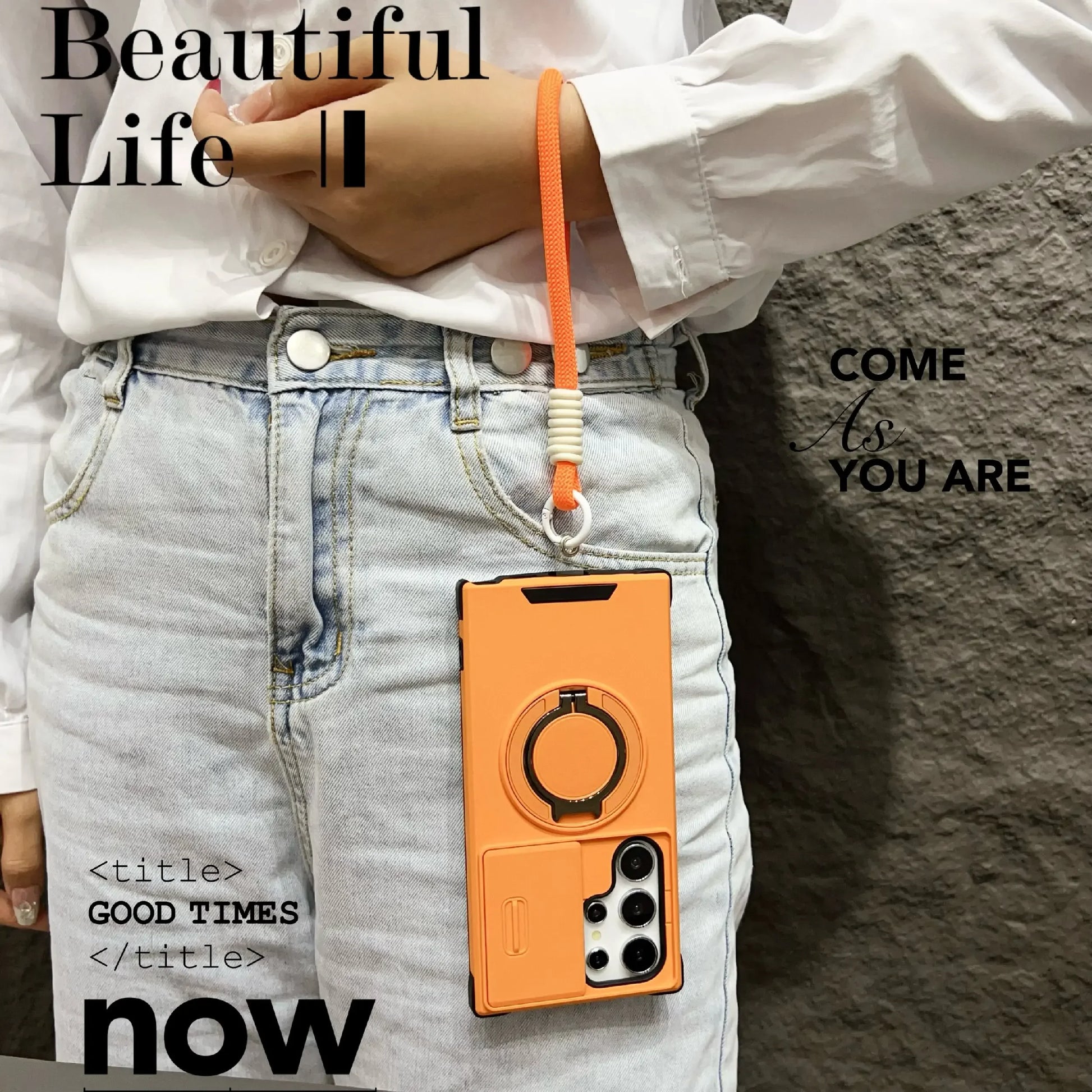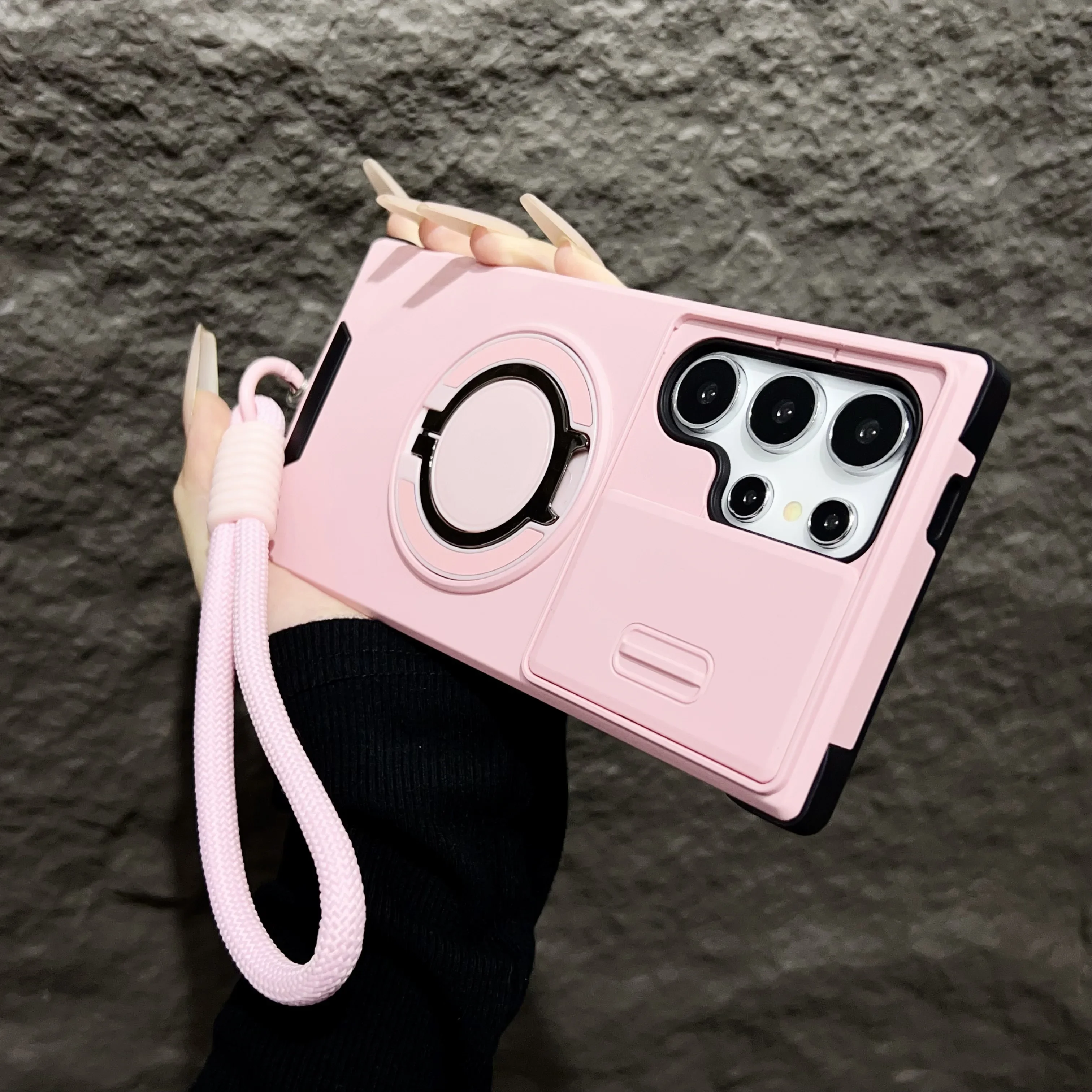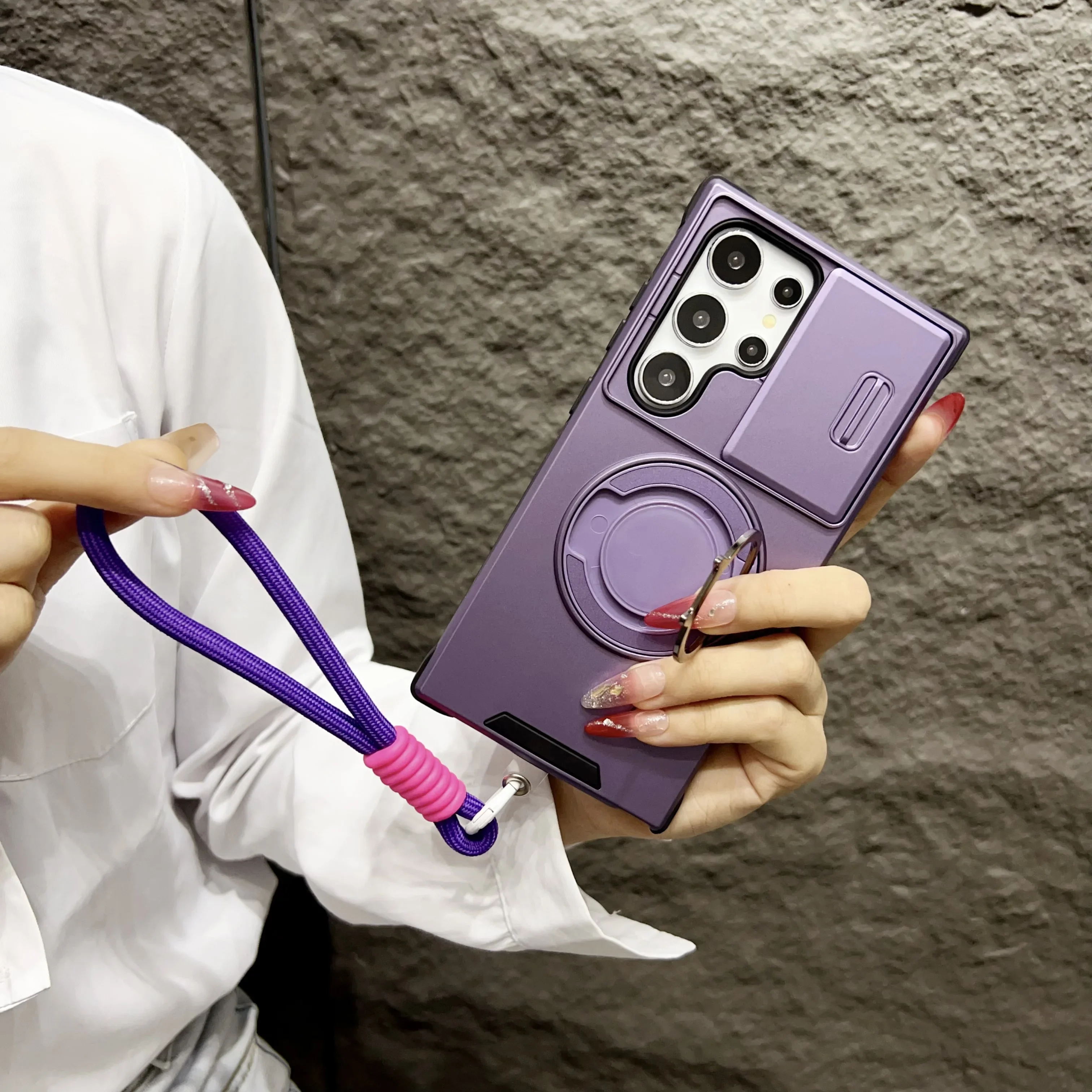 Armor Magnetic Bracket Case For Samsung Galaxy S25 S24 S23 S22 S21 Ultra Plus With Lanyard Slide Camera Protect Shockproof Cover