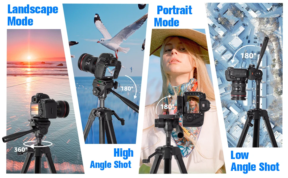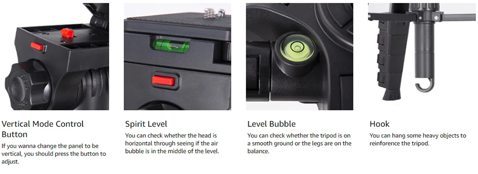 【CONSIDERATE DESIGNS & USAGE】: There are two level beads, one is on the head, the other one is on the body. So that you can check whether the ground or the device is stay in a horizontal mode. The tripod head is detachable, a good choose for carrying with. Before you install the head, you need to tighten the horizontal adjustment control knob. And there is a hook to hanging heaver objects if you have the need to reinforce the tripod especially when use outdoor. Perfect for photography and video.