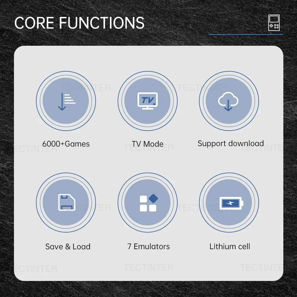 This handheld game console has more than 6000 selected classic games, 3.0 HD screen ,high-definition smooth screen with high-precision joystick, support for downloading and collecting games, support for 7 kinds of emulators, covering a wide range of games.