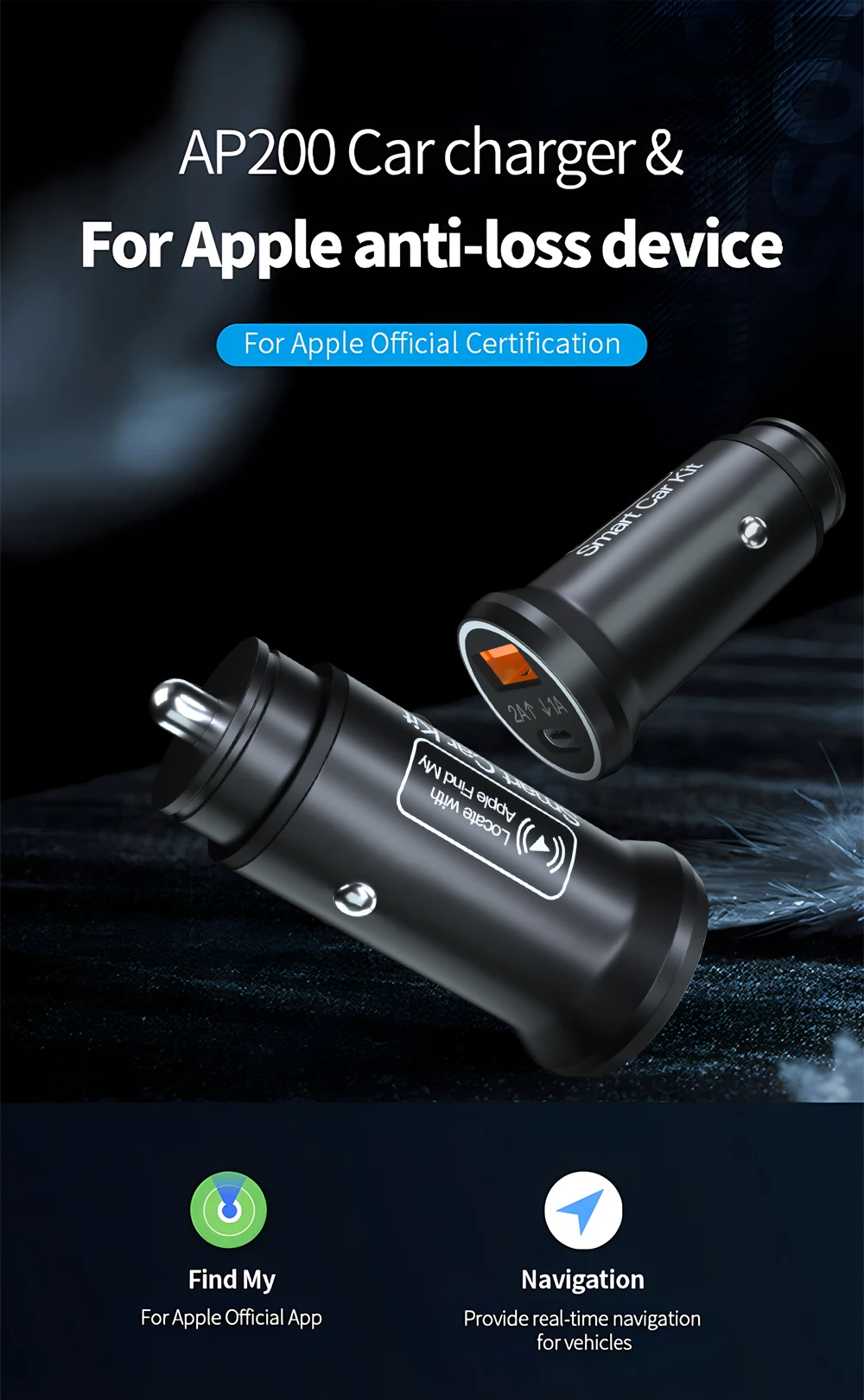 GRANDNAVI Universal Mini Car Charger Cigarette Lighter USB Type-C Adapter Hidden GPS Locator Track For IOS Apple System Find My