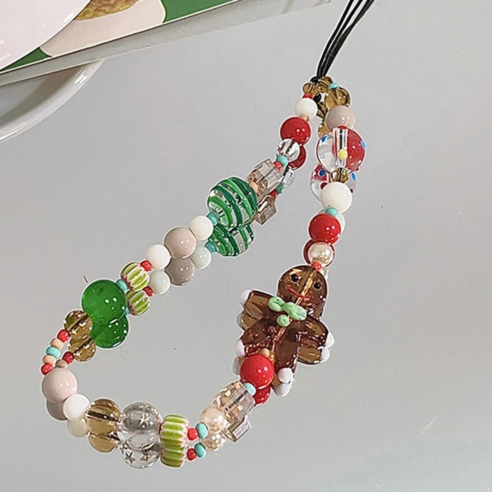 Korean Cute 3D Christmas Gingerbread Man Beaded Phone Acrylic Pendant Keychain For iPhone Girl Anti-Lost Chain Hanging Jewelry