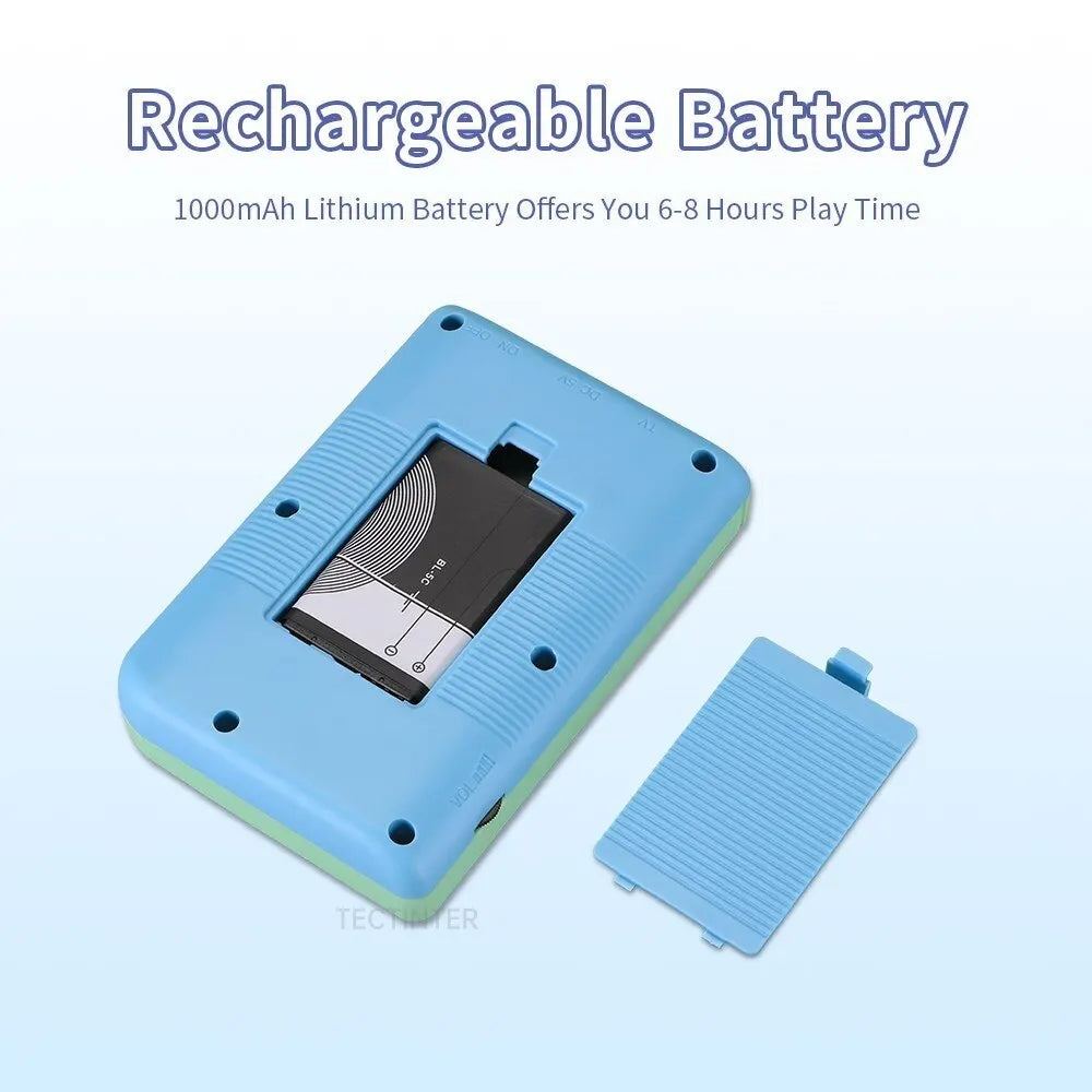 This handheld console comes with 1020mAh rechargeable lithium battery, more than 6 hours of battery life. When you are on a business trip, traveling, camping, you don't have to worry about running out of power.